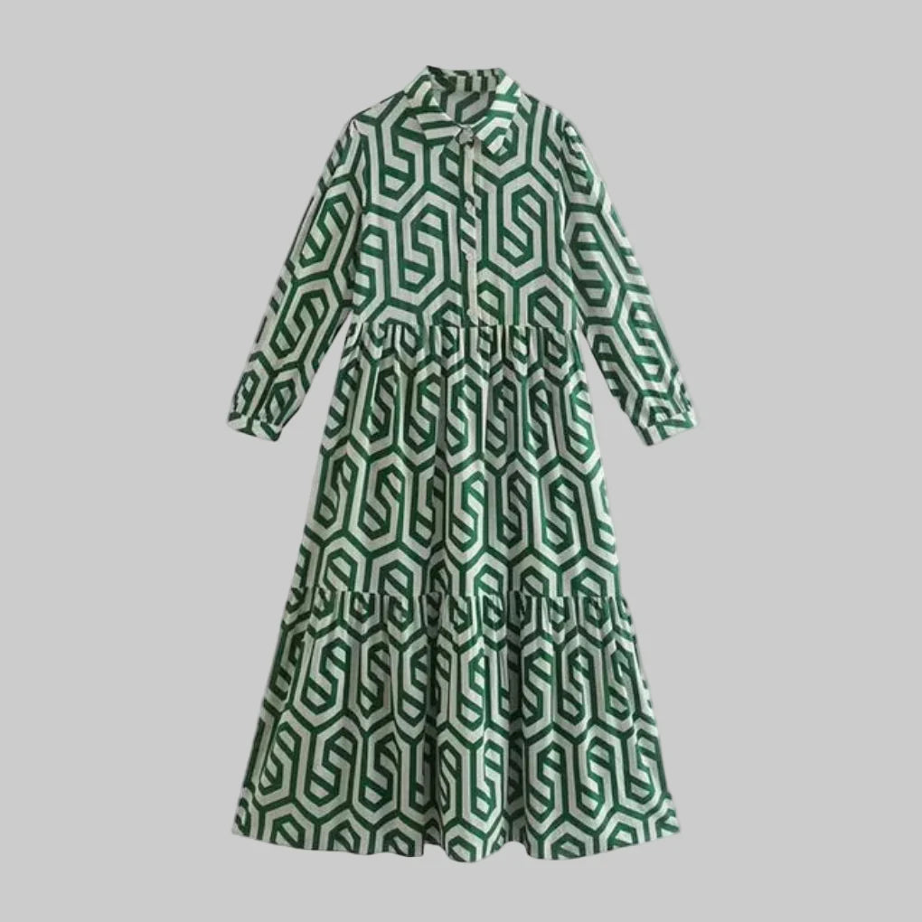 Modern design meets expressive print in this women’s long-sleeve dress, called “Ottilia.” Its geometric pattern and clean collar bring a bold and stylish edge, while its silhouette works from daytime to evening events.