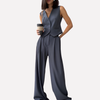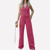 Dieses zweiteilige Set, bestehend aus einer einfarbigen, ärmellosen Weste und einer langen Hose, ist ideal für einen eleganten Urlaub oder einen legeren Business-Look und sorgt für ein stimmiges und gepflegtes Erscheinungsbild. Die klare Silhouette der Weste und die gerade geschnittene Hose ergeben ein vielseitiges Outfit, das sowohl für entspannte Ausflüge als auch für formelle Anlässe geeignet ist.