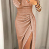 Setzen Sie ein Statement mit dem figurbetonten Kleid Eris, das Ihre Kurven betont und Luxus ausstrahlt. Dieses wadenlange Kleid aus glänzender, heller Seide hat eine hohe Taille und einen stilvollen schulterfreien Ausschnitt und ist somit perfekt für Abendveranstaltungen, Partys oder besondere Anlässe.