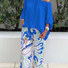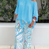 Das Angelique-Set ist der Inbegriff müheloser Eleganz, perfekt für warme Tage und schicke Ausflüge. Mit einem luftigen schulterfreien Oberteil mit weiten Laternenärmeln und einer passenden Hose mit weitem Bein, verziert mit einem abstrakten Retro-Print, bietet dieses Ensemble sowohl Komfort als auch Stil.