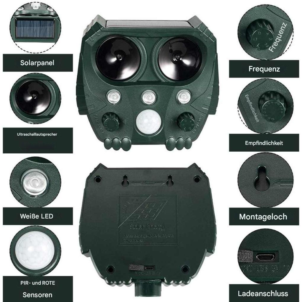 Dieses Ultraschall-Abwehrmittel bietet eine sichere, humane und energieeffiziente Möglichkeit, Ihr Grundstück vor unerwünschten Tieren zu schützen. Seine große Reichweite, die einstellbaren Sensoren und das robuste Design machen es zu einer zuverlässigen Lösung, um Gärten, Rasenflächen und Außenbereiche schädlingsfrei zu halten.
